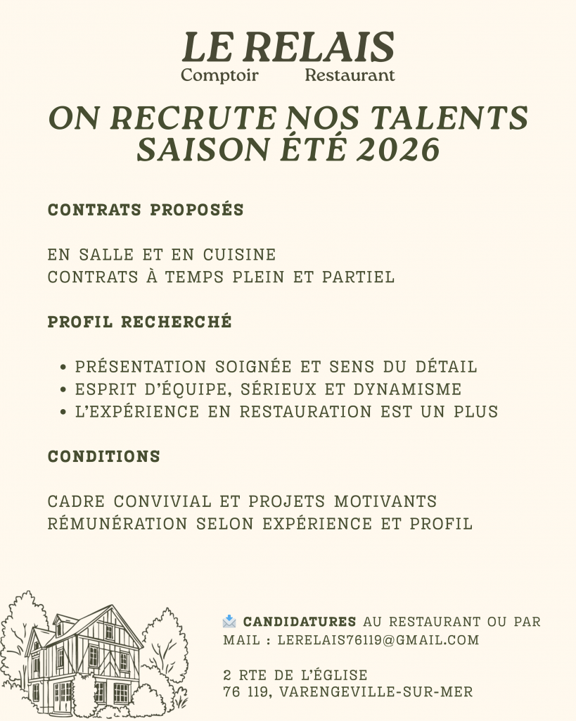 Situé à Varengeville-sur-Mer, à quelques minutes de Dieppe, Le Relais est un restaurant de terroir ancré dans l’histoire locale. Repris fin 2025, l’établissement entame une nouvelle étape tout en conservant l’esprit d’une maison conviviale et accessible.